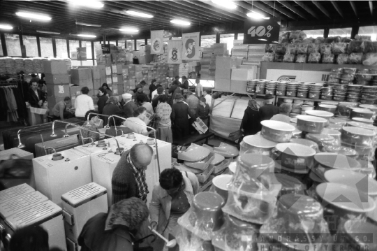 Skála Coop ÁFÉSZ lábas tömeg leértékelés kazán kályha mosdó kosár polc doboz áru áruház Szekszárd Tolna megye Magyarország 1981 Bakó JenőFotó részletei