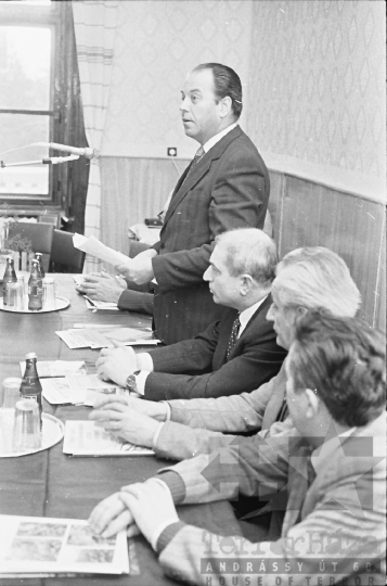 AZONOSÍTÓ: THM-BJ-00714 Férfi beszédet mond. [A szocialista brigádmozgalom szovjet mintára az 1950-es évek végén kezdett kibontakozni Magyarországon, és rendszerváltoztatáskor szűnt meg. Kezdetben csak az ipari üzemekben és gyárakban alakultak meg a brigádok, majd az agráriumban és a hivatali szférában is létrejöttek. A mozgalom jelszava: „Szocialista módon dolgozni, tanulni és élni” volt.] HELYSZÍN: Szekszárd, Tolna megye DÁTUM: 1977 FOTÓS: Bakó Jenő