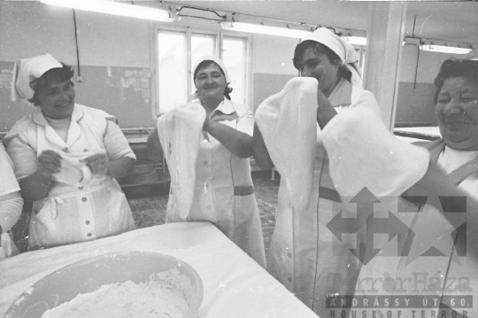 termelőszövetkezet tésztafeldolgozás üzem kendő köpeny Alsónána Tolna megye Magyarország 1982 Bakó JenőFotó részletei