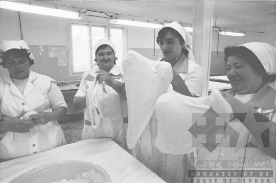 termelőszövetkezet tésztafeldolgozás üzem kendő köpeny Alsónána Tolna megye Magyarország 1982 Bakó JenőFotó részletei