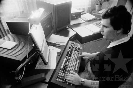 nyomdaipar nyomda nyomdász fényszedés fényszedőgép monitor klaviatúra Szekszárd Tolna megye Magyarország 1982 Bakó JenőFotó részletei