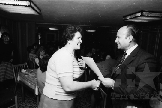 AZONOSÍTÓ: THM-BJ-00715 A rendezvény résztvevői. [A szocialista brigádmozgalom szovjet mintára az 1950-es évek végén kezdett kibontakozni Magyarországon, és rendszerváltoztatáskor szűnt meg. Kezdetben csak az ipari üzemekben és gyárakban alakultak meg a brigádok, majd az agráriumban és a hivatali szférában is létrejöttek. A mozgalom jelszava: „Szocialista módon dolgozni, tanulni és élni” volt.] HELYSZÍN: Szekszárd, Tolna megye DÁTUM: 1977 FOTÓS: Bakó Jenő