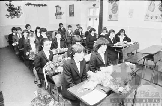diák iskola ünnepség évzáró ünneplő ballagás tanterem virág iskolapad Paks Tolna megye Magyarország 1983 Bakó Jenő