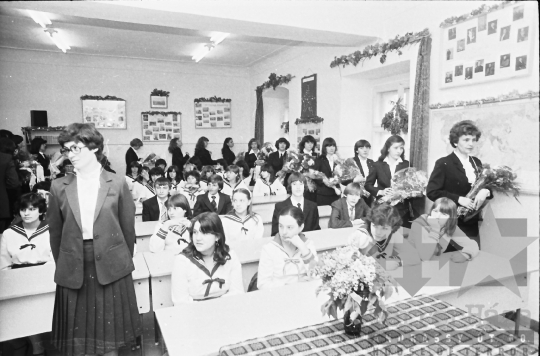 diák iskola ünnepség évzáró ünneplő ballagás tanterem virág iskolapad matrózblúz Paks Tolna megye Magyarország 1983 Bakó JenőFotó részletei
