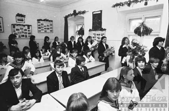 diák iskola ünnepség évzáró ünneplő ballagás tanterem virág iskolapad matrózblúz Paks Tolna megye Magyarország 1983 Bakó JenőFotó részletei
