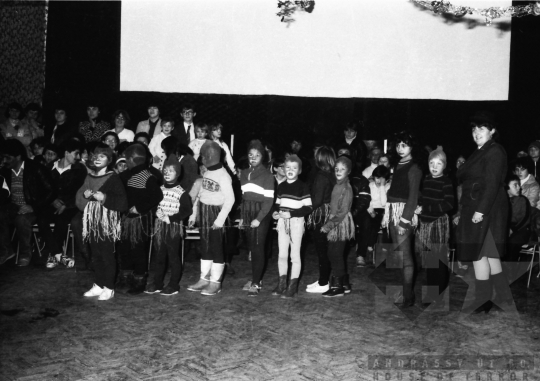 AZONOSÍTÓ: THM-BJ-00718 Néptánc produkció a színpadon - transzparenseken feliratok: "Hatékonyabb munkával a XI. pártkongresszus határozatainak következetes végrehajtásáért" "Munkánk minőségének és hatékonyságának javításával, többletvállalásokkal készülünk a NAGY OKT. SZOC. FORR. 60. évfordulójára". [Az októberi orosz forradalom (kommunista propagandában: nagy októberi szocialista forradalom) 1917. november 6–12. (október 24–30.) között zajlott, amelynek során a bolsevikok a Téli Palota ostroma után az ott székelő Ideiglenes Kormány tagjait letartóztatták, és Lenin vezetésével, akit a Népbiztosok Tanácsa elnökévé választottak, puccsal átvették a hatalmat. Hazánkban ez a nap 1950-től 1989-ig pártállami ünnep volt.] [A szocialista brigádmozgalom szovjet mintára az 1950-es évek végén kezdett kibontakozni Magyarországon, és rendszerváltoztatáskor szűnt meg. Kezdetben csak az ipari üzemekben és gyárakban alakultak meg a brigádok, majd az agráriumban és a hivatali szférában is létrejöttek. A mozgalom jelszava: „Szocialista módon dolgozni, tanulni és élni” volt.] HELYSZÍN: Szekszárd, Tolna megye DÁTUM: 1977 FOTÓS: Bakó Jenő