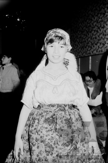 AZONOSÍTÓ: THM-BJ-00718 Néptánc produkció a színpadon - transzparenseken feliratok: "Hatékonyabb munkával a XI. pártkongresszus határozatainak következetes végrehajtásáért" "Munkánk minőségének és hatékonyságának javításával, többletvállalásokkal készülünk a NAGY OKT. SZOC. FORR. 60. évfordulójára". [Az októberi orosz forradalom (kommunista propagandában: nagy októberi szocialista forradalom) 1917. november 6–12. (október 24–30.) között zajlott, amelynek során a bolsevikok a Téli Palota ostroma után az ott székelő Ideiglenes Kormány tagjait letartóztatták, és Lenin vezetésével, akit a Népbiztosok Tanácsa elnökévé választottak, puccsal átvették a hatalmat. Hazánkban ez a nap 1950-től 1989-ig pártállami ünnep volt.] [A szocialista brigádmozgalom szovjet mintára az 1950-es évek végén kezdett kibontakozni Magyarországon, és rendszerváltoztatáskor szűnt meg. Kezdetben csak az ipari üzemekben és gyárakban alakultak meg a brigádok, majd az agráriumban és a hivatali szférában is létrejöttek. A mozgalom jelszava: „Szocialista módon dolgozni, tanulni és élni” volt.] HELYSZÍN: Szekszárd, Tolna megye DÁTUM: 1977 FOTÓS: Bakó Jenő