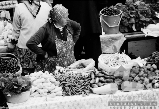 stand kosár zöldség gyümölcs borsó paprika uborka tök bab krumpli burgonya hagyma árus kofa piac Szekszárd Tolna megye Magyarország 1985 Bakó Jenő