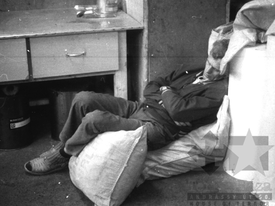 AZONOSÍTÓ: THM-BJ-00717 Férfi beszédet mond - transzparensen felirat: "Munkánk minőségének és hatékonyságának javításával, többletvállalásokkal készülünk a NAGY OKT. SZOC. FORR. 60. évfordulójára". [Az októberi orosz forradalom (kommunista propagandában: nagy októberi szocialista forradalom) 1917. november 6–12. (október 24–30.) között zajlott, amelynek során a bolsevikok a Téli Palota ostroma után az ott székelő Ideiglenes Kormány tagjait letartóztatták, és Lenin vezetésével, akit a Népbiztosok Tanácsa elnökévé választottak, puccsal átvették a hatalmat. Hazánkban ez a nap 1950-től 1989-ig pártállami ünnep volt.] [A szocialista brigádmozgalom szovjet mintára az 1950-es évek végén kezdett kibontakozni Magyarországon, és rendszerváltoztatáskor szűnt meg. Kezdetben csak az ipari üzemekben és gyárakban alakultak meg a brigádok, majd az agráriumban és a hivatali szférában is létrejöttek. A mozgalom jelszava: „Szocialista módon dolgozni, tanulni és élni” volt.] HELYSZÍN: Szekszárd, Tolna megye DÁTUM: 1977 FOTÓS: Bakó Jenő
