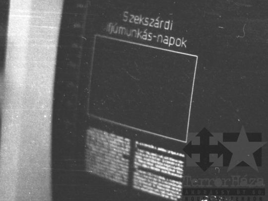 AZONOSÍTÓ: THM-BJ-00717 Férfi beszédet mond - transzparensen felirat: "Munkánk minőségének és hatékonyságának javításával, többletvállalásokkal készülünk a NAGY OKT. SZOC. FORR. 60. évfordulójára". [Az októberi orosz forradalom (kommunista propagandában: nagy októberi szocialista forradalom) 1917. november 6–12. (október 24–30.) között zajlott, amelynek során a bolsevikok a Téli Palota ostroma után az ott székelő Ideiglenes Kormány tagjait letartóztatták, és Lenin vezetésével, akit a Népbiztosok Tanácsa elnökévé választottak, puccsal átvették a hatalmat. Hazánkban ez a nap 1950-től 1989-ig pártállami ünnep volt.] [A szocialista brigádmozgalom szovjet mintára az 1950-es évek végén kezdett kibontakozni Magyarországon, és rendszerváltoztatáskor szűnt meg. Kezdetben csak az ipari üzemekben és gyárakban alakultak meg a brigádok, majd az agráriumban és a hivatali szférában is létrejöttek. A mozgalom jelszava: „Szocialista módon dolgozni, tanulni és élni” volt.] HELYSZÍN: Szekszárd, Tolna megye DÁTUM: 1977 FOTÓS: Bakó Jenő