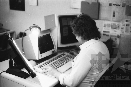 nyomdaipar nyomda sajtó nyomdász fényszedés fényszedőgép monitor klaviatúra Szekszárd Tolna megye Magyarország 1988 Bakó JenőFotó részletei