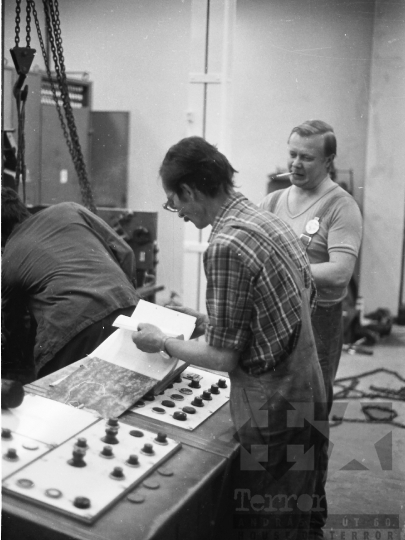 AZONOSÍTÓ: THM-BJ-00717 Férfi beszédet mond - transzparensen felirat: "Munkánk minőségének és hatékonyságának javításával, többletvállalásokkal készülünk a NAGY OKT. SZOC. FORR. 60. évfordulójára". [Az októberi orosz forradalom (kommunista propagandában: nagy októberi szocialista forradalom) 1917. november 6–12. (október 24–30.) között zajlott, amelynek során a bolsevikok a Téli Palota ostroma után az ott székelő Ideiglenes Kormány tagjait letartóztatták, és Lenin vezetésével, akit a Népbiztosok Tanácsa elnökévé választottak, puccsal átvették a hatalmat. Hazánkban ez a nap 1950-től 1989-ig pártállami ünnep volt.] [A szocialista brigádmozgalom szovjet mintára az 1950-es évek végén kezdett kibontakozni Magyarországon, és rendszerváltoztatáskor szűnt meg. Kezdetben csak az ipari üzemekben és gyárakban alakultak meg a brigádok, majd az agráriumban és a hivatali szférában is létrejöttek. A mozgalom jelszava: „Szocialista módon dolgozni, tanulni és élni” volt.] HELYSZÍN: Szekszárd, Tolna megye DÁTUM: 1977 FOTÓS: Bakó Jenő
