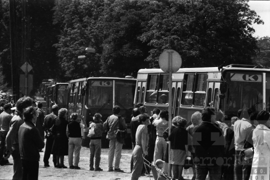 A gyászünnep résztvevői és buszok az Új köztemető bejáratánál.