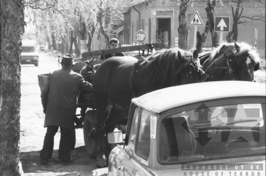 utcakép Trabant autó lovas kocsi Szekszárd Tolna megye Magyarország 1988 Bakó JenőFotó részletei