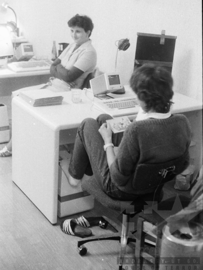 nyomdaipar nyomda nyomdász fényszedőgép monitor klaviatúra pohár fürdőpapucs Szekszárd Tolna megye Magyarország 1987 Bakó JenőFotó részletei