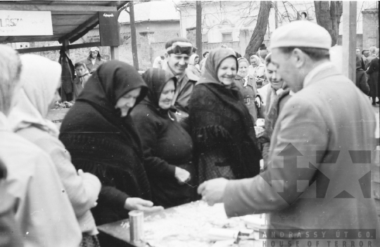 árus kendő parasztasszony stand piac Bonyhád Tolna megye Magyarország 1962 Bakó JenőFotó részletei