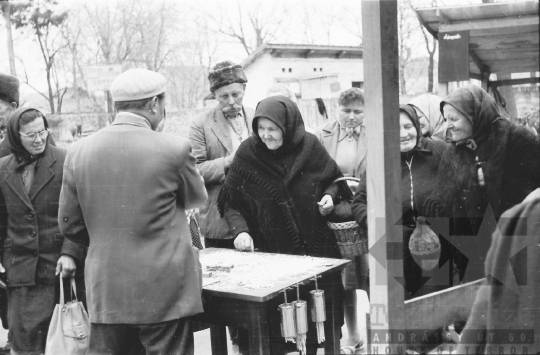 árus kendő parasztasszony stand kosár piac Bonyhád Tolna megye Magyarország 1962 Bakó JenőFotó részletei