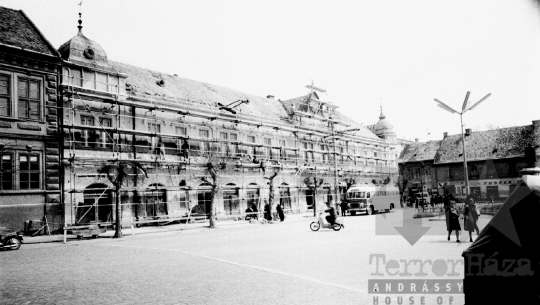utcakép építkezés állványzat autóbusz motor belváros Szekszárd Tolna megye Magyarország 1966 Bakó JenőFotó részletei