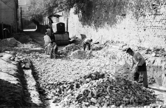 útépítés úthenger utcakép lapát tégla Szekszárd Tolna megye Magyarország 1966 Bakó JenőFotó részletei