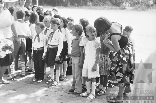 általános iskola diák iskola ünnepség évzáró ünneplő kisdobos egyenruha ballagás Mórágy Tolna megye Magyarország 1984 Bakó JenőFotó részletei