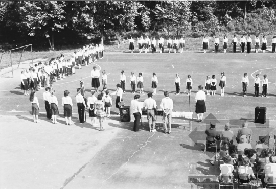 általános iskola diák iskola ünnepség évzáró ünneplő kisdobos úttörő egyenruha ballagás Mórágy Tolna megye Magyarország 1984 Bakó JenőFotó részletei