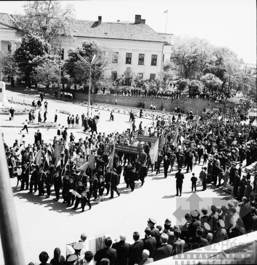 szocialista állami ünnep május 1. munka ünnepe felvonulás transzparens zászló vasút Szekszárd Tolna megye Magyarország 1966 Bakó JenőFotó részletei