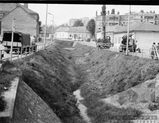 utcakép meder korlát családi ház patak panelház munkagép teherautó Szekszárd Tolna megye Magyarország 1977 Bakó JenőFotó részletei