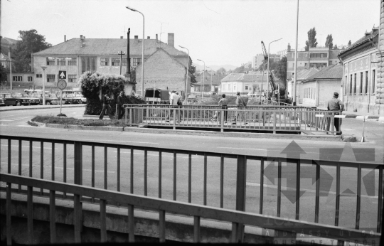 AZONOSÍTÓ: THM-BJ-00717 Férfi beszédet mond - transzparensen felirat: "Munkánk minőségének és hatékonyságának javításával, többletvállalásokkal készülünk a NAGY OKT. SZOC. FORR. 60. évfordulójára". [Az októberi orosz forradalom (kommunista propagandában: nagy októberi szocialista forradalom) 1917. november 6–12. (október 24–30.) között zajlott, amelynek során a bolsevikok a Téli Palota ostroma után az ott székelő Ideiglenes Kormány tagjait letartóztatták, és Lenin vezetésével, akit a Népbiztosok Tanácsa elnökévé választottak, puccsal átvették a hatalmat. Hazánkban ez a nap 1950-től 1989-ig pártállami ünnep volt.] [A szocialista brigádmozgalom szovjet mintára az 1950-es évek végén kezdett kibontakozni Magyarországon, és rendszerváltoztatáskor szűnt meg. Kezdetben csak az ipari üzemekben és gyárakban alakultak meg a brigádok, majd az agráriumban és a hivatali szférában is létrejöttek. A mozgalom jelszava: „Szocialista módon dolgozni, tanulni és élni” volt.] HELYSZÍN: Szekszárd, Tolna megye DÁTUM: 1977 FOTÓS: Bakó Jenő
