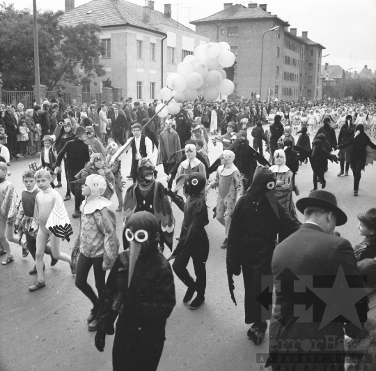 AZONOSÍTÓ: THM-BJ-00718 Néptánc produkció a színpadon - transzparenseken feliratok: "Hatékonyabb munkával a XI. pártkongresszus határozatainak következetes végrehajtásáért" "Munkánk minőségének és hatékonyságának javításával, többletvállalásokkal készülünk a NAGY OKT. SZOC. FORR. 60. évfordulójára". [Az októberi orosz forradalom (kommunista propagandában: nagy októberi szocialista forradalom) 1917. november 6–12. (október 24–30.) között zajlott, amelynek során a bolsevikok a Téli Palota ostroma után az ott székelő Ideiglenes Kormány tagjait letartóztatták, és Lenin vezetésével, akit a Népbiztosok Tanácsa elnökévé választottak, puccsal átvették a hatalmat. Hazánkban ez a nap 1950-től 1989-ig pártállami ünnep volt.] [A szocialista brigádmozgalom szovjet mintára az 1950-es évek végén kezdett kibontakozni Magyarországon, és rendszerváltoztatáskor szűnt meg. Kezdetben csak az ipari üzemekben és gyárakban alakultak meg a brigádok, majd az agráriumban és a hivatali szférában is létrejöttek. A mozgalom jelszava: „Szocialista módon dolgozni, tanulni és élni” volt.] HELYSZÍN: Szekszárd, Tolna megye DÁTUM: 1977 FOTÓS: Bakó Jenő