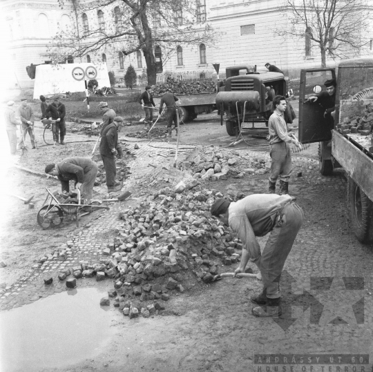 utcakép útépítés utcakő talicska lapát KRESZ-tábla Szekszárd Tolna megye Magyarország 1968 Bakó JenőFotó részletei