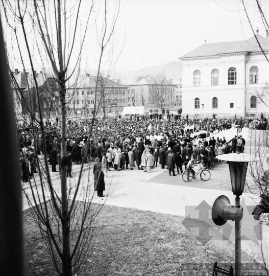 AZONOSÍTÓ: THM-BJ-00717 Férfi beszédet mond - transzparensen felirat: "Munkánk minőségének és hatékonyságának javításával, többletvállalásokkal készülünk a NAGY OKT. SZOC. FORR. 60. évfordulójára". [Az októberi orosz forradalom (kommunista propagandában: nagy októberi szocialista forradalom) 1917. november 6–12. (október 24–30.) között zajlott, amelynek során a bolsevikok a Téli Palota ostroma után az ott székelő Ideiglenes Kormány tagjait letartóztatták, és Lenin vezetésével, akit a Népbiztosok Tanácsa elnökévé választottak, puccsal átvették a hatalmat. Hazánkban ez a nap 1950-től 1989-ig pártállami ünnep volt.] [A szocialista brigádmozgalom szovjet mintára az 1950-es évek végén kezdett kibontakozni Magyarországon, és rendszerváltoztatáskor szűnt meg. Kezdetben csak az ipari üzemekben és gyárakban alakultak meg a brigádok, majd az agráriumban és a hivatali szférában is létrejöttek. A mozgalom jelszava: „Szocialista módon dolgozni, tanulni és élni” volt.] HELYSZÍN: Szekszárd, Tolna megye DÁTUM: 1977 FOTÓS: Bakó Jenő