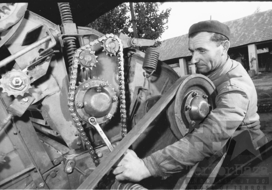 termelőszövetkezet munkagép svájci sapka Mözs Tolna megye Magyarország 1966 Bakó JenőFotó részletei