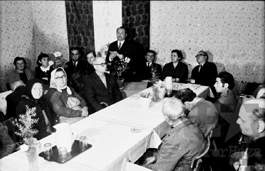 AZONOSÍTÓ: THM-BJ-00714 Férfi beszédet mond. [A szocialista brigádmozgalom szovjet mintára az 1950-es évek végén kezdett kibontakozni Magyarországon, és rendszerváltoztatáskor szűnt meg. Kezdetben csak az ipari üzemekben és gyárakban alakultak meg a brigádok, majd az agráriumban és a hivatali szférában is létrejöttek. A mozgalom jelszava: „Szocialista módon dolgozni, tanulni és élni” volt.] HELYSZÍN: Szekszárd, Tolna megye DÁTUM: 1977 FOTÓS: Bakó Jenő