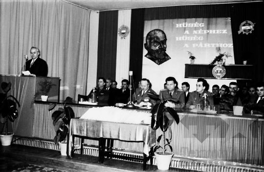 K. Papp József, a Tolna megyei pártbizottság első titkára beszédet mond a pódiumon, háttérben felirat: "Hűség a néphez, hűség a párthoz" és Lenin-kép.