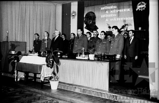 MSZMP karhatalom ünnepség beszéd munkásőrség munkásőr egyenruha párttitkár mikrofon Szekszárd Tolna megye Magyarország 1966 Bakó Jenő