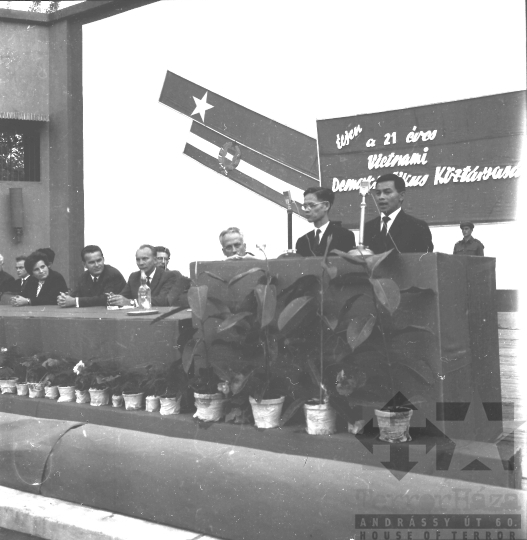 szocialista ország békemozgalom zászló Kádár-címer mikrofon pódium békegyűlés transzparens diplomácia Szekszárd Tolna megye Magyarország 1966 Bakó JenőFotó részletei