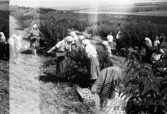 termelőszövetkezet betakarítás gyümölcsös barack láda kendő kötény Báta Tolna megye Magyarország 1967 Bakó JenőFotó részletei