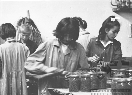 társadalmi munka konzervgyár befőttes üveg raktár köpeny Paks Tolna megye Magyarország 1967 Bakó JenőFotó részletei