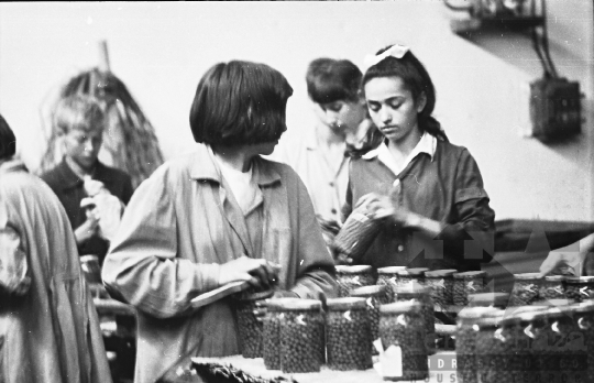 társadalmi munka konzervgyár befőttes üveg raktár köpeny Paks Tolna megye Magyarország 1967 Bakó JenőFotó részletei