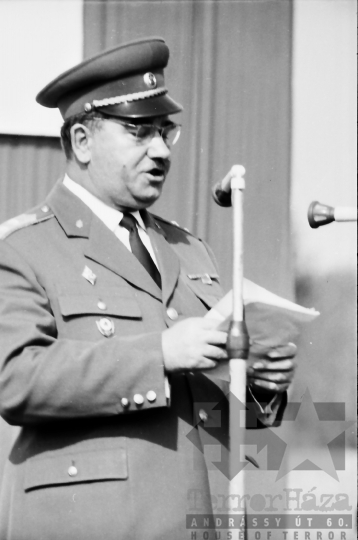 katonaság repülőnap repülőtér légi bemutató MHSZ beszéd mikrofon katona tiszt egyenruha Őcsény Tolna megye Magyarország 1967 Bakó JenőFotó részletei