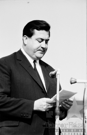 AZONOSÍTÓ: THM-BJ-00714 Férfi beszédet mond. [A szocialista brigádmozgalom szovjet mintára az 1950-es évek végén kezdett kibontakozni Magyarországon, és rendszerváltoztatáskor szűnt meg. Kezdetben csak az ipari üzemekben és gyárakban alakultak meg a brigádok, majd az agráriumban és a hivatali szférában is létrejöttek. A mozgalom jelszava: „Szocialista módon dolgozni, tanulni és élni” volt.] HELYSZÍN: Szekszárd, Tolna megye DÁTUM: 1977 FOTÓS: Bakó Jenő