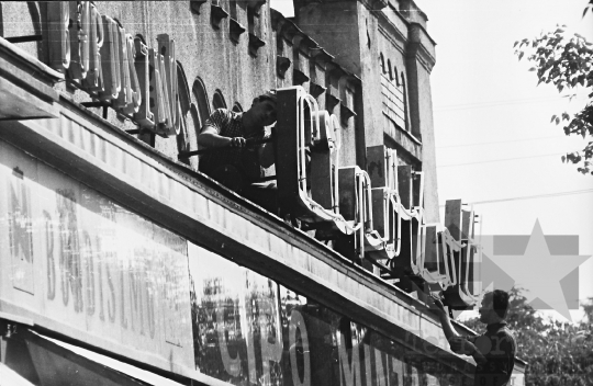 AZONOSÍTÓ: THM-BJ-00717 Férfi beszédet mond - transzparensen felirat: "Munkánk minőségének és hatékonyságának javításával, többletvállalásokkal készülünk a NAGY OKT. SZOC. FORR. 60. évfordulójára". [Az októberi orosz forradalom (kommunista propagandában: nagy októberi szocialista forradalom) 1917. november 6–12. (október 24–30.) között zajlott, amelynek során a bolsevikok a Téli Palota ostroma után az ott székelő Ideiglenes Kormány tagjait letartóztatták, és Lenin vezetésével, akit a Népbiztosok Tanácsa elnökévé választottak, puccsal átvették a hatalmat. Hazánkban ez a nap 1950-től 1989-ig pártállami ünnep volt.] [A szocialista brigádmozgalom szovjet mintára az 1950-es évek végén kezdett kibontakozni Magyarországon, és rendszerváltoztatáskor szűnt meg. Kezdetben csak az ipari üzemekben és gyárakban alakultak meg a brigádok, majd az agráriumban és a hivatali szférában is létrejöttek. A mozgalom jelszava: „Szocialista módon dolgozni, tanulni és élni” volt.] HELYSZÍN: Szekszárd, Tolna megye DÁTUM: 1977 FOTÓS: Bakó Jenő