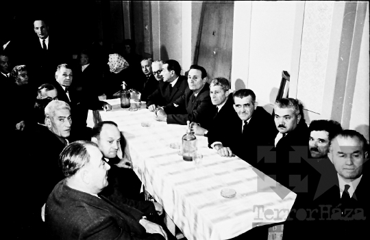 AZONOSÍTÓ: THM-BJ-00740 Zenészek asztal mellett játszanak. [TOTÉV: Tolna megyei Tatarozó és Építő Vállalat 1950. október végén a megyeszerte működő kisipari szövetkezetek összevonásával alakult meg, 1968 közepére szocialista középvállalattá nőtte ki magát Tm. Tanácsi Építőipari Vállalat néven.] HELYSZÍN: Szekszárd, Tolna megye DÁTUM: 1977 FOTÓS: Bakó Jenő