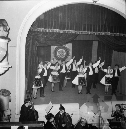 AZONOSÍTÓ: THM-BJ-00718 Néptánc produkció a színpadon - transzparenseken feliratok: "Hatékonyabb munkával a XI. pártkongresszus határozatainak következetes végrehajtásáért" "Munkánk minőségének és hatékonyságának javításával, többletvállalásokkal készülünk a NAGY OKT. SZOC. FORR. 60. évfordulójára". [Az októberi orosz forradalom (kommunista propagandában: nagy októberi szocialista forradalom) 1917. november 6–12. (október 24–30.) között zajlott, amelynek során a bolsevikok a Téli Palota ostroma után az ott székelő Ideiglenes Kormány tagjait letartóztatták, és Lenin vezetésével, akit a Népbiztosok Tanácsa elnökévé választottak, puccsal átvették a hatalmat. Hazánkban ez a nap 1950-től 1989-ig pártállami ünnep volt.] [A szocialista brigádmozgalom szovjet mintára az 1950-es évek végén kezdett kibontakozni Magyarországon, és rendszerváltoztatáskor szűnt meg. Kezdetben csak az ipari üzemekben és gyárakban alakultak meg a brigádok, majd az agráriumban és a hivatali szférában is létrejöttek. A mozgalom jelszava: „Szocialista módon dolgozni, tanulni és élni” volt.] HELYSZÍN: Szekszárd, Tolna megye DÁTUM: 1977 FOTÓS: Bakó Jenő
