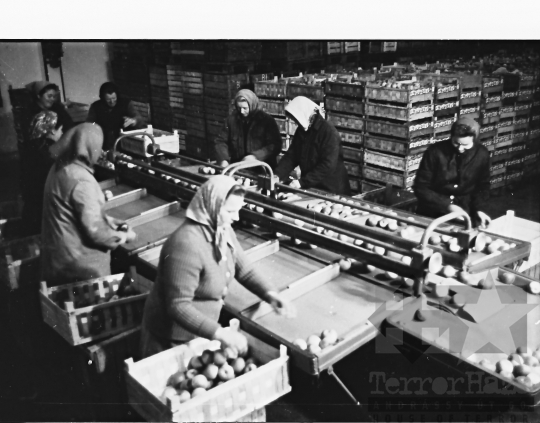 termelőszövetkezet láda kendő alma szállítószalag Mözs Tolna megye Magyarország 1968 Bakó JenőFotó részletei