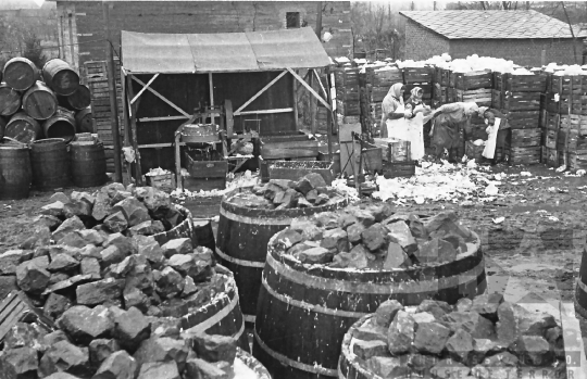 szövetkezet üzem savanyúság hordó káposzta kendő gumicsizma kötény Nagydorog Tolna megye Magyarország 1968 Bakó JenőFotó részletei
