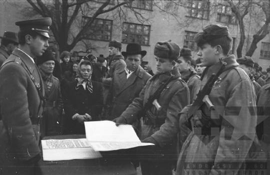 AZONOSÍTÓ: THM-BJ-00717 Férfi beszédet mond - transzparensen felirat: "Munkánk minőségének és hatékonyságának javításával, többletvállalásokkal készülünk a NAGY OKT. SZOC. FORR. 60. évfordulójára". [Az októberi orosz forradalom (kommunista propagandában: nagy októberi szocialista forradalom) 1917. november 6–12. (október 24–30.) között zajlott, amelynek során a bolsevikok a Téli Palota ostroma után az ott székelő Ideiglenes Kormány tagjait letartóztatták, és Lenin vezetésével, akit a Népbiztosok Tanácsa elnökévé választottak, puccsal átvették a hatalmat. Hazánkban ez a nap 1950-től 1989-ig pártállami ünnep volt.] [A szocialista brigádmozgalom szovjet mintára az 1950-es évek végén kezdett kibontakozni Magyarországon, és rendszerváltoztatáskor szűnt meg. Kezdetben csak az ipari üzemekben és gyárakban alakultak meg a brigádok, majd az agráriumban és a hivatali szférában is létrejöttek. A mozgalom jelszava: „Szocialista módon dolgozni, tanulni és élni” volt.] HELYSZÍN: Szekszárd, Tolna megye DÁTUM: 1977 FOTÓS: Bakó Jenő