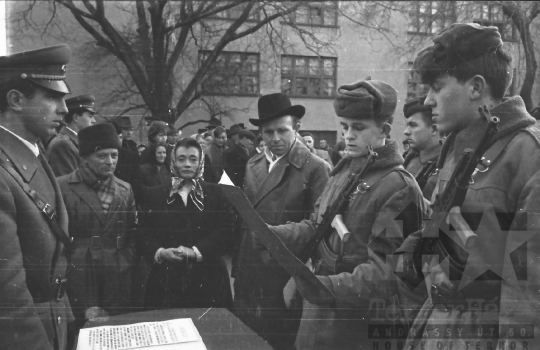 katonaság egyenruha néphadsereg eskü ünnepség laktanya lőfegyver AK-47-es gépkarabély katona Szekszárd Tolna megye Magyarország 1968 Bakó JenőFotó részletei