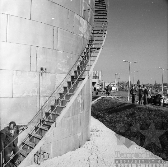 tűzoltóság tűzoltás gyakorlat fűtőerőmű energiaipar teherautó Szekszárd Tolna megye Magyarország 1977 Bakó JenőFotó részletei