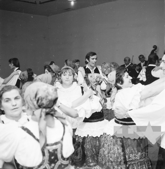 AZONOSÍTÓ: THM-BJ-00718 Néptánc produkció a színpadon - transzparenseken feliratok: "Hatékonyabb munkával a XI. pártkongresszus határozatainak következetes végrehajtásáért" "Munkánk minőségének és hatékonyságának javításával, többletvállalásokkal készülünk a NAGY OKT. SZOC. FORR. 60. évfordulójára". [Az októberi orosz forradalom (kommunista propagandában: nagy októberi szocialista forradalom) 1917. november 6–12. (október 24–30.) között zajlott, amelynek során a bolsevikok a Téli Palota ostroma után az ott székelő Ideiglenes Kormány tagjait letartóztatták, és Lenin vezetésével, akit a Népbiztosok Tanácsa elnökévé választottak, puccsal átvették a hatalmat. Hazánkban ez a nap 1950-től 1989-ig pártállami ünnep volt.] [A szocialista brigádmozgalom szovjet mintára az 1950-es évek végén kezdett kibontakozni Magyarországon, és rendszerváltoztatáskor szűnt meg. Kezdetben csak az ipari üzemekben és gyárakban alakultak meg a brigádok, majd az agráriumban és a hivatali szférában is létrejöttek. A mozgalom jelszava: „Szocialista módon dolgozni, tanulni és élni” volt.] HELYSZÍN: Szekszárd, Tolna megye DÁTUM: 1977 FOTÓS: Bakó Jenő
